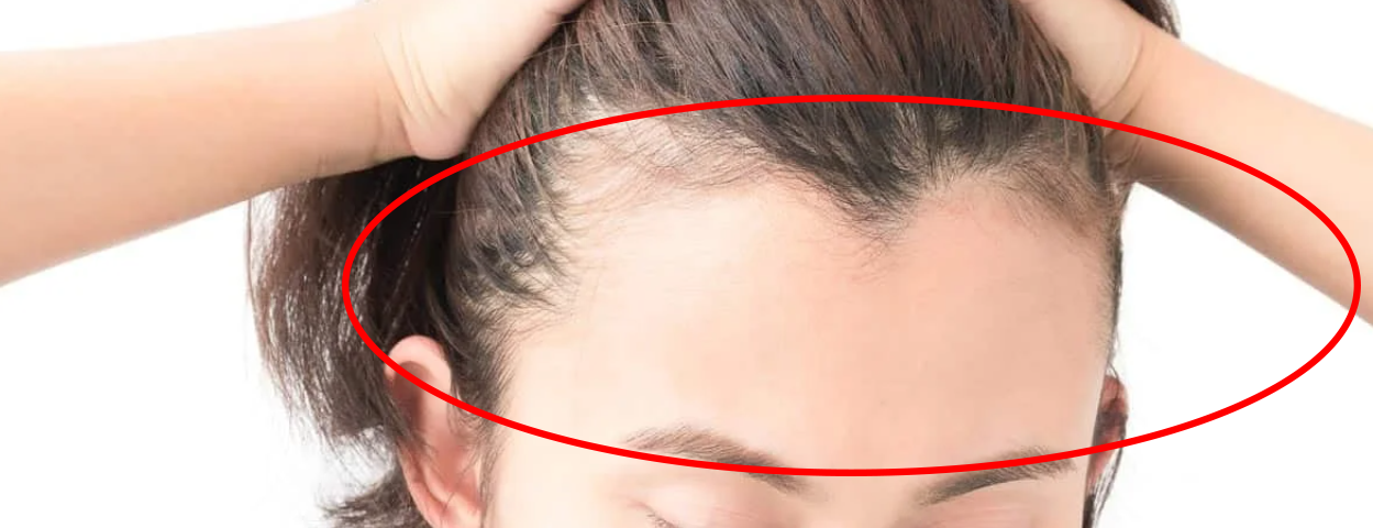 ลักษณะของพื้นที่บริเวณหน้าผากเยอะ แนวผมหน้าผากถอยร่นขึ้นไป และมีทรงเว้าลึก โดยมีไรผมเป็นปลายแหลมชี้ลงมาตรงกลาง เมื่อมองจากด้านหน้าจะเป็นลักษณะคล้ายตัวอักษรภาษาอังกฤษอย่างตัว M
